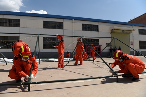 經(jīng)過(guò)20多分鐘的應(yīng)急演練,兩座防震帳篷按要求迅速搭建成功,1名受傷人員在緊急醫(yī)療救護(hù)后被迅速送往醫(yī)院。隨后,演習(xí)指揮部詳細(xì)檢查了防震帳篷搭設(shè)情況,聽取了各搶險(xiǎn)隊(duì)伍巡檢匯報(bào)。