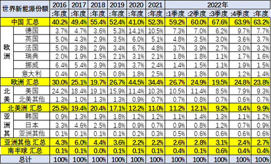2021年全年的歐洲新能源市場受疫情影響,新能源增長較弱。2022年仍受到疫情影響,歐洲2022年較2021年份額下降較大。近期中國新能源乘用車的增速強(qiáng)于世界平均增長速度,2020年中國新能源乘用車世界份額較大反轉(zhuǎn)。2021年中國全年保持52%,較強(qiáng)。2022年1-12月的中國占世界新能源份額達(dá)到63.2%,其中10-12月的中國占世界份額63.9%。