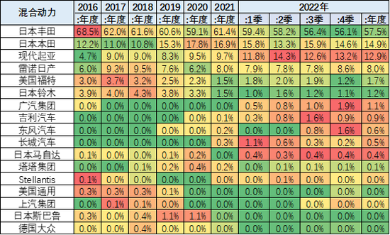 2018-2021年混動占比持續(xù)下降并逐步實現(xiàn)份額穩(wěn)定?;旌蟿恿Τ擞密噺?012年的廣義新能源93%逐步下降到2015年的79%,隨后混合動力的占比每年降10個百分點。2019年混動市場份額下滑1個百分點,但2020年開始加速下降,2022年份額仍下降到26%以下,12月降到20%。