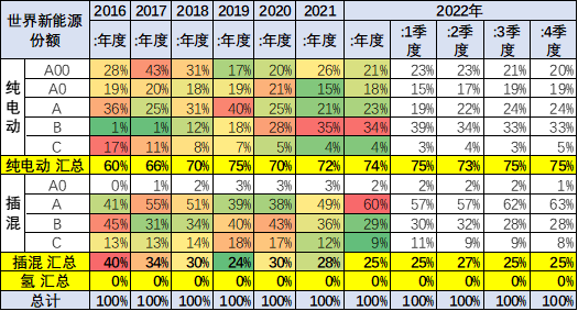 世界新能源車的發(fā)展從混合動力開始,隨后逐步進(jìn)入電池為主的時代,純電動和插混成為新能源真正政策的支持主力。