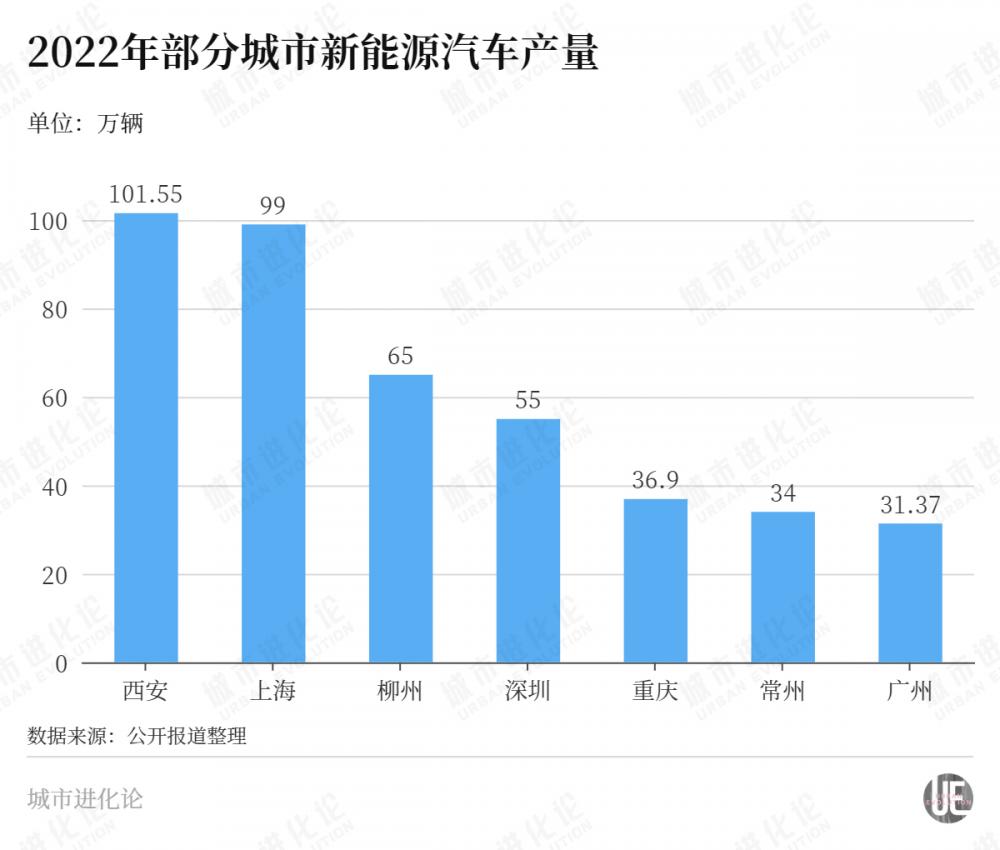 從更大的范圍來看,西安、上海、柳州、深圳、重慶、常州、廣州2022年新能源汽車產(chǎn)量從101.55萬輛到31.37萬輛不等,其中西安、深圳、重慶增速均超過100%,分別達(dá)到277.5%、183.4%以及142.5%,增長強(qiáng)勁。