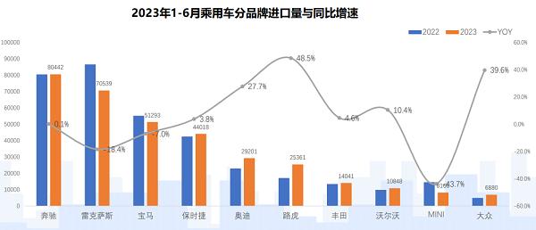 上半年,進(jìn)口車前十品牌中,奔馳、保時(shí)捷、奧迪、路虎、豐田、沃爾沃、大眾等七個(gè)品牌實(shí)現(xiàn)正增長(zhǎng),其中,奔馳同比上升0.1%至80442輛,排名第一。而寶馬和MINI,則由于車型國(guó)產(chǎn)導(dǎo)致銷量分別下滑7%和43.7%;雷克薩斯也因?yàn)橹髁囆虴S銷量疲軟下滑了18.4%。