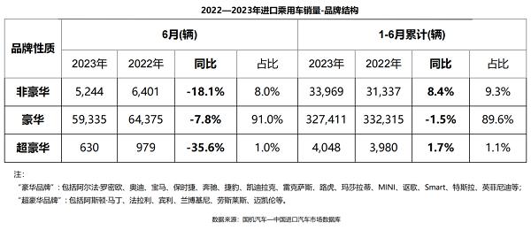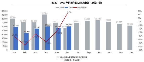 今年6月,我國(guó)乘用車進(jìn)口6.1萬輛(含底盤),同比增長(zhǎng)6.7%;1-6月累計(jì)進(jìn)口33.8萬輛,同比下滑23.3%,主要原因?yàn)閲?guó)內(nèi)市場(chǎng)消費(fèi)結(jié)構(gòu)改變及電動(dòng)化轉(zhuǎn)型降低了對(duì)燃油車的需求。銷量方面,6月,進(jìn)口乘用車終端銷售6.5萬輛,同比下滑9.1%,環(huán)比增長(zhǎng)6.6%。1-6月,進(jìn)口乘用車?yán)塾?jì)銷售36.5萬輛,同比微降0.6%;相比之下,新能源進(jìn)口車銷量同比漲幅接近七成。