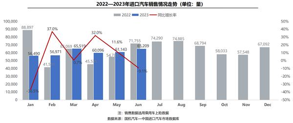 綜合中國(guó)汽車流通協(xié)會(huì)進(jìn)口車工作委員會(huì)及國(guó)機(jī)汽車發(fā)布的信息,今年6月我國(guó)進(jìn)口汽車6.3萬輛,同比上升8.6%。1-6月,累計(jì)進(jìn)口汽車34.6萬輛,同比下滑22.4%;累計(jì)進(jìn)口金額1500.7億元,同比下滑17.5%。