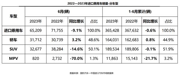 銷量方面,6月,進(jìn)口乘用車終端銷售6.5萬輛,結(jié)束了連續(xù)四個(gè)月的增長(zhǎng)態(tài)勢(shì)。同比下滑9.1%,環(huán)比增長(zhǎng)6.6%。1-6月,進(jìn)口乘用車?yán)塾?jì)銷售36.5萬輛,同比微降0.6%。