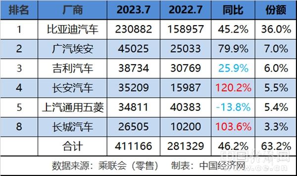 傳統(tǒng)新能源延續(xù)著近幾個月來的競爭格局。7月,6家上榜的傳統(tǒng)品牌合計銷量達411166輛,同比增長46.2%;其中,比亞迪、廣汽埃安穩(wěn)居前兩名,吉利、長安、上汽通用五菱、長城銷量均在3萬輛上下。前7月,傳統(tǒng)新能源依然是這6家企業(yè)上榜,合計銷量超過231萬輛,同比增長59.2%。