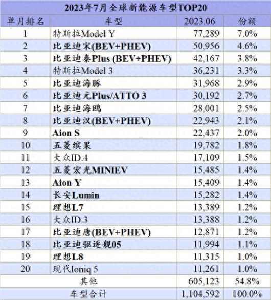 具體而言,在熱銷(xiāo)車(chē)型TOP20中,作為特斯拉當(dāng)前最得力的銷(xiāo)量支柱,7月Model Y又一次刷新季度初月份的最好成績(jī),以7.7萬(wàn)輛牢牢守住單月銷(xiāo)量冠軍的寶座,遙遙領(lǐng)先于身后的比亞迪宋和比亞迪秦Plus。