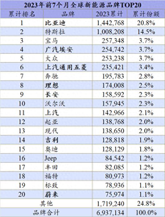再?gòu)钠放瓢駟蝸?lái)看,得益于宋、秦Plus、元plus、海豚和海鷗等主銷(xiāo)車(chē)型,在國(guó)內(nèi)和海外市場(chǎng)的雙重發(fā)力,7月比亞迪又一次刷新自身的最高紀(jì)錄達(dá)到25.0萬(wàn)輛,前7個(gè)月的總銷(xiāo)量也達(dá)到144.3萬(wàn)輛。