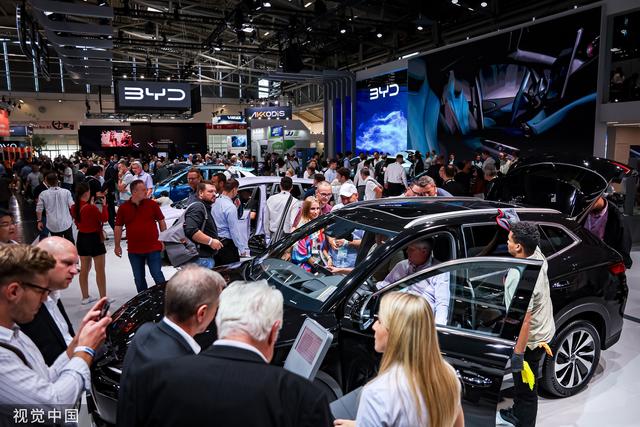 當?shù)貢r間2023年9月6日,在德國慕尼黑舉行的2023國際車展上,參觀者在觀看中國汽車品牌比亞迪的新能源汽車。@視覺中國