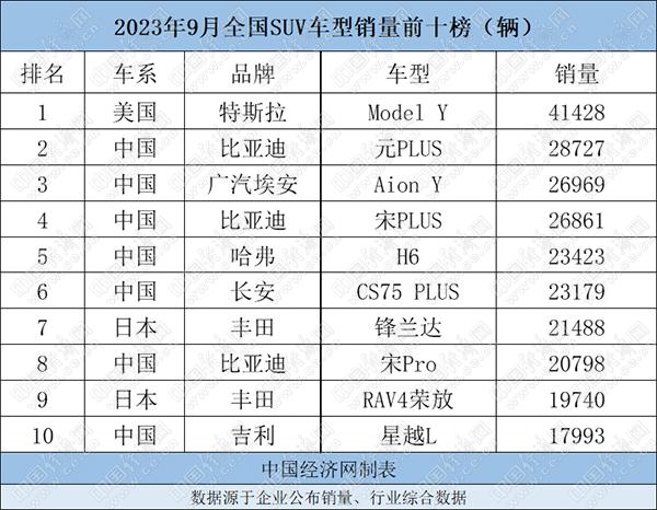 聚焦具體車型表現(xiàn),特斯拉Model Y共售出41428輛,強(qiáng)勢收獲月度五連冠。比亞迪(002594)元PLUS、宋PLUS、宋Pro銷量齊齊突破2萬輛,三款車型合計銷量達(dá)76386輛,占前十SUV總銷量的30.48%,更顯整體實力。