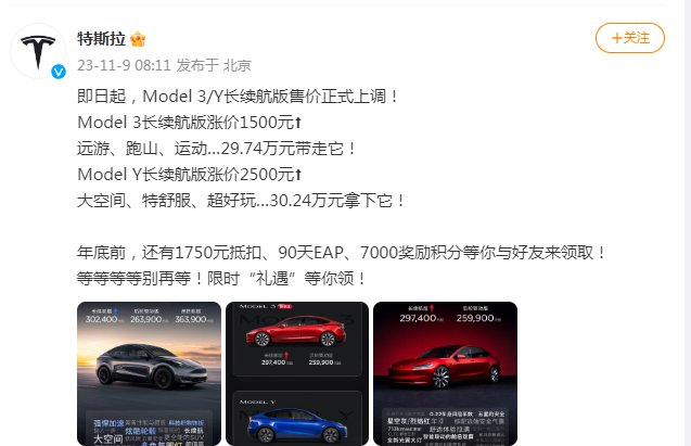 11月9日,特斯拉官方微博發(fā)布消息,即日起,Model 3/Y長(zhǎng)續(xù)航版售價(jià)正式上調(diào),Model 3長(zhǎng)續(xù)航版漲價(jià)1500元至29.74萬(wàn)元。Model Y長(zhǎng)續(xù)航版漲價(jià)2500元至30.24萬(wàn)元。
