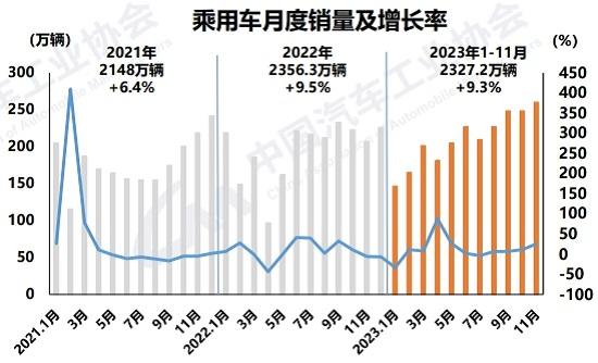 綜合1-11月,乘用車產(chǎn)銷分別完成2344.1萬(wàn)輛和2327.2萬(wàn)輛,同比分別增長(zhǎng)8%和9.3%。其中,乘用車國(guó)內(nèi)銷量為1955.2萬(wàn)輛,同比增長(zhǎng)2.7%;出口372萬(wàn)輛,同比增長(zhǎng)65.1%。