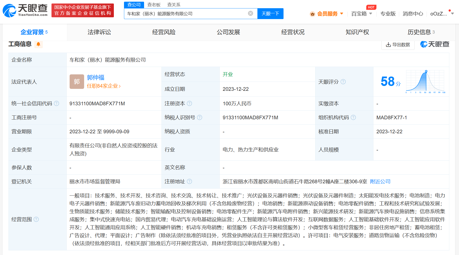 近日,車和家(麗水)能源服務(wù)有限公司成立,法定代表人為郭仲福,注冊(cè)資本100萬(wàn)人民幣,經(jīng)營(yíng)范圍含光伏設(shè)備及元器件制造、電池制造、電力電子元器件銷售、電池零配件生產(chǎn)、人工智能應(yīng)用軟件開(kāi)發(fā)、小微型客車租賃經(jīng)營(yíng)服務(wù)等。股東信息顯示,該公司由理想汽車旗下北京車和家能源服務(wù)有限公司全資持股。