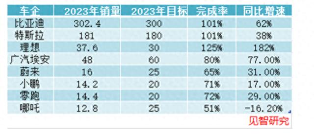 在2023年,新能源汽車市場的競爭特征是價(jià)格戰(zhàn)頻繁、新車型連續(xù)推出、新技術(shù)不斷引入。頭部車企在這一年中保持了較高的銷量完成度,顯示出強(qiáng)大的市場競爭力。相比之下,造車新勢力的表現(xiàn)則不一,有的超額完成目標(biāo),有的則難以達(dá)到預(yù)期,顯示出市場的分化趨勢。