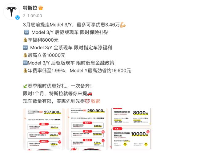 3月1日,特斯拉宣布Model 3、Model Y限時特惠,3月底前提走Model 3/Y,最多可享優(yōu)惠3.46萬。本次特斯拉降價頗為低調,沒有直接調降車價,而是以保險補貼、車漆福利等名目促銷。Model 3后驅版新車價245900元,保險補貼后低至237900元。Model Y后驅版新車價258900元,保險補貼后低至250900元。