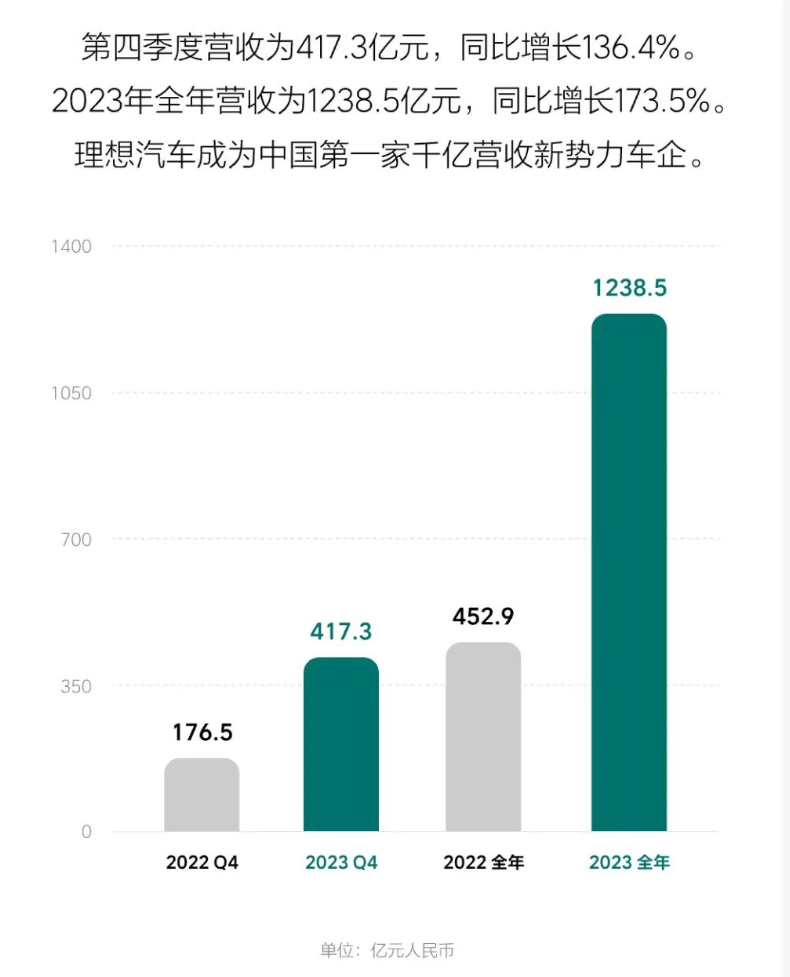 財(cái)報(bào)顯示,理想汽車2023年全年實(shí)現(xiàn)營收1238.5億元,同比增長(zhǎng)173.5%,為國內(nèi)首家營收突破千億元的新勢(shì)力車企。2023年凈利潤為118.1億元,而2022年凈虧損20.3億元,實(shí)現(xiàn)了自交付以來的全面盈利,成為繼特斯拉、比亞迪之后全球第三家實(shí)現(xiàn)盈利的新能源車企。其中,2023年四季度凈利潤為57.5億元,同比增長(zhǎng)2068.2%。