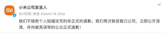或是前兩條微博未能引起智己重視,4月9日凌晨,小米公司發(fā)言人官微向智己發(fā)出最后通牒,“對(duì)于智己公司近期一而再、再而三的騷擾、抹黑行為,我們的忍讓是有限度的。”