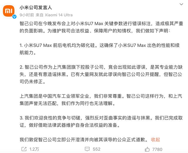 小米公司發(fā)言人先是表示:智己公司在今晚發(fā)布會(huì)上對(duì)小米SU7 Max關(guān)鍵參數(shù)進(jìn)行錯(cuò)誤標(biāo)注,造成極其嚴(yán)重的負(fù)面影響。小米SU7 Max 前后電機(jī)均為碳化硅。這確保了小米SU7 Max 出色的性能和續(xù)航能力。