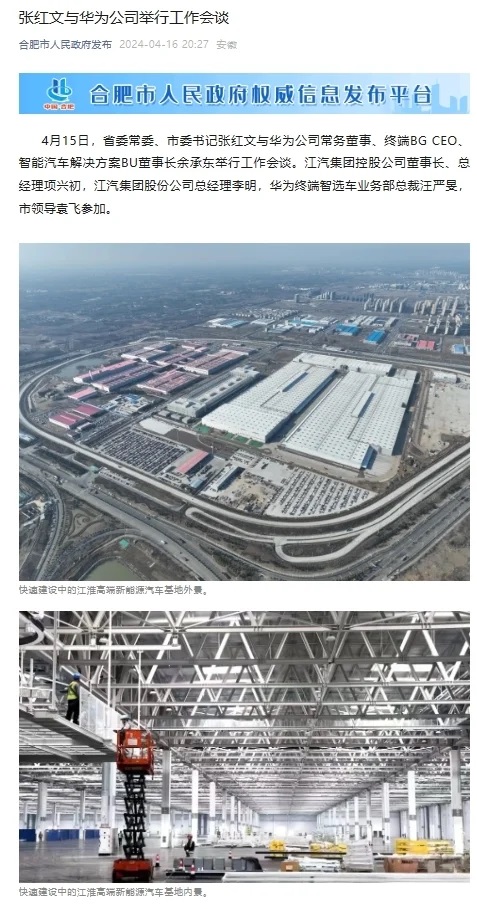 2023年12月,江淮汽車(chē)發(fā)布公告稱(chēng),與華為終端有限公司簽署《智能新能源汽車(chē)合作協(xié)議》。雙方將基于華為智能汽車(chē)解決方案,在產(chǎn)品開(kāi)發(fā)、生產(chǎn)制造、銷(xiāo)售、服務(wù)等多個(gè)領(lǐng)域全面合作,著力打造豪華智能網(wǎng)聯(lián)電動(dòng)汽車(chē)。