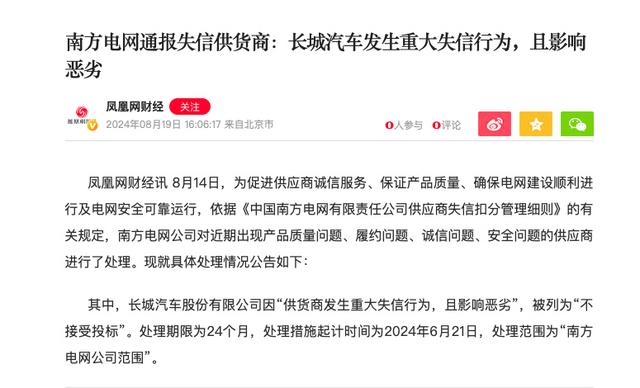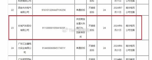 其中,長(zhǎng)城汽車(chē)股份有限公司因“供貨商發(fā)生重大失信行為,且影響惡劣”,被列為“不接受投標(biāo)”。處理期限為24個(gè)月,處理措施起計(jì)時(shí)間為2024年6月21日,處理范圍為“南方電網(wǎng)公司范圍”。