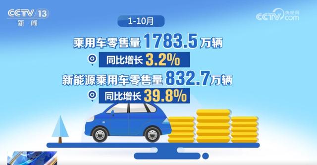 在以舊換新政策的帶動(dòng)下,汽車(chē)銷(xiāo)量也有了明顯增長(zhǎng)。10月份,乘用車(chē)零售量226.1萬(wàn)輛,同比增長(zhǎng)11.3%,增速較9月加快6.8個(gè)百分點(diǎn)。其中,新能源乘用車(chē)零售量119.6萬(wàn)輛,同比增長(zhǎng)56.7%,增速較9月加快5.8個(gè)百分點(diǎn),占乘用車(chē)零售量的比重達(dá)52.9%。1—10月,乘用車(chē)零售量1783.5萬(wàn)輛,同比增長(zhǎng)3.2%。其中,新能源乘用車(chē)零售量832.7萬(wàn)輛,同比增長(zhǎng)39.8%。(央視網(wǎng))
