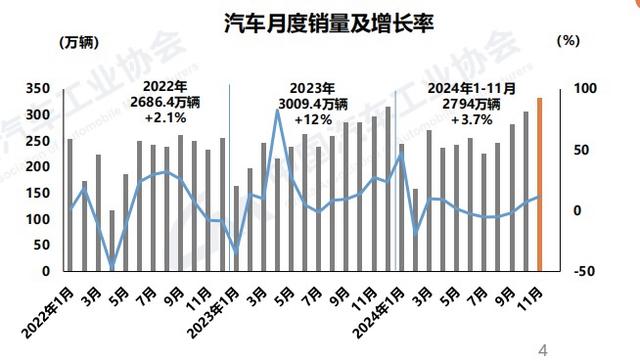 中汽協(xié)數(shù)據(jù)顯示,1~11月,我國汽車產(chǎn)銷分別完成2790.3萬輛和2794萬輛,同比分別增長(zhǎng)2.9%和3.7%,汽車產(chǎn)量增速較1~10月擴(kuò)大1.1個(gè)百分點(diǎn),銷量增速擴(kuò)大1個(gè)百分點(diǎn)。