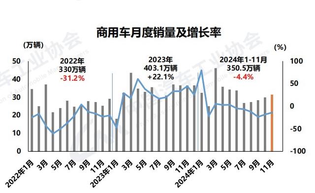 數(shù)據(jù)顯示,1~11月,商用車國內(nèi)銷量為267.9萬輛,同比下降9.9%;商用車出口量為82.6萬輛,同比增長(zhǎng)19.3%。其中,11月,商用車國內(nèi)銷量24.4萬輛,同比下降15.8%;商用車出口7.1萬輛,同比下降6.6%。