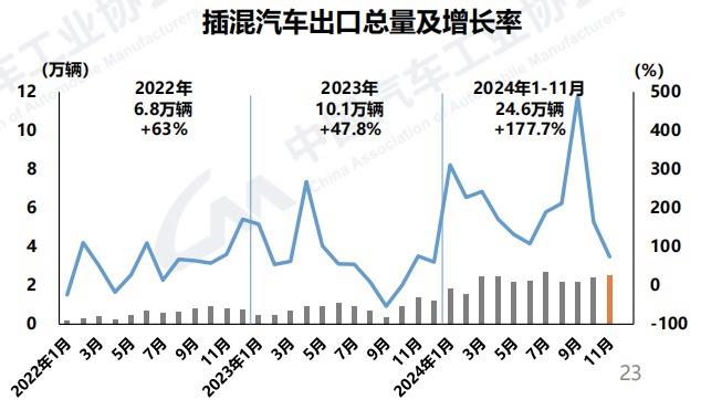 細(xì)分來看,插電式混合動(dòng)力汽車出口增速已遠(yuǎn)超純電動(dòng)汽車。數(shù)據(jù)顯示,1~11月,我國純電動(dòng)汽車出口89.4萬輛,同比下降10.8%;插電式混合動(dòng)力汽車出口24.6萬輛,同比增長(zhǎng)1.8倍。其中,11月,純電動(dòng)汽車出口5.8萬輛,環(huán)比下降43.8%,同比下降29.2%;插電式混合動(dòng)力汽車出口2.5萬輛,環(huán)比增長(zhǎng)1.9%,同比增長(zhǎng)74.3%。