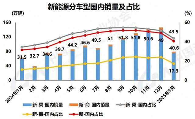 中汽協(xié)最新數(shù)據(jù)顯示,2025年1月,新能源乘用車國內銷量占乘用車國內銷量比例為43.5%,這一比例已經連續(xù)4個月環(huán)比下跌,也是在去年9月達到最高點后,第二個月跌至50%以下。去年9月,國內新能源乘用車滲透率達到歷史最高點,為54.5%。