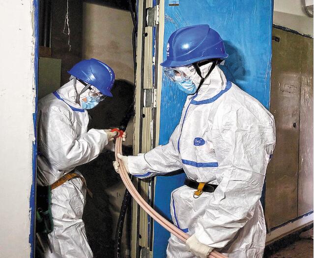 3月24日,遼寧遼陽(yáng)供電公司接到當(dāng)?shù)卣块T通知,為作為臨時(shí)防疫隔離點(diǎn)的文圣區(qū)廣場(chǎng)社區(qū)居民樓開(kāi)展用電檢查和接電工作,保障隔離人員用電。圖為供電員工排查到電纜異常后,在居民樓內(nèi)重新敷設(shè)電纜。