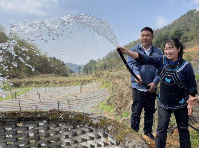 劉彬(左一)協(xié)調(diào)下瓦窯村生態(tài)農(nóng)業(yè)項(xiàng)目實(shí)現(xiàn)了通電引水(貴陽(yáng)供電局供圖)。