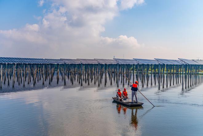國(guó)網(wǎng)南京供電公司工作人員對(duì)六合通威“漁光一體”光伏電站進(jìn)行檢查