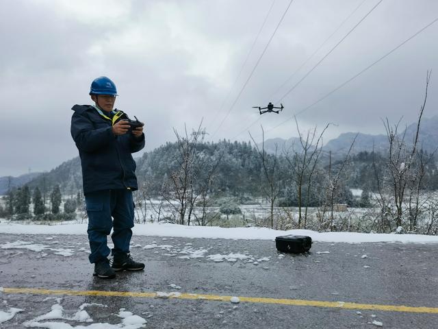 雪鵝毛般下得很大,一路上車很少,鄭鋒將車提前裝好防滑鏈后一直保持不超過(guò)30碼的車速小心行駛,到達(dá)110千伏黃牽線40號(hào)塔附近,室外氣溫已達(dá)-5度,迎著刮臉刺骨的風(fēng),4人向塔所在的山腰挺進(jìn)。一時(shí)間雪下小了,短暫的“空窗期”給了他們飛無(wú)人機(jī)的絕佳機(jī)會(huì)。
