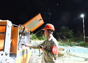 中國電力網(wǎng)訊 8月11日凌晨1時,在武漢黃陂區(qū)蔡家榨街道周里河,由湖北送變電工程有限公司承建的武漢1000千伏變電站配套500千伏線路送出工程N30-N31跨越滬蓉高鐵架線施工現(xiàn)場, 面臨高鐵“空窗”時間極短、氣溫炎熱等困難,該公司加強事前籌劃和作業(yè)中安全管控督導(dǎo),運用集控智能可視化系統(tǒng)對牽張設(shè)備進行操作和監(jiān)控,投入無人機空中照明系統(tǒng)等新裝備助力夜間施工,地面人員認真展放導(dǎo)線,鐵塔上的工人一絲不茍進行高空作業(yè),全體施工人員密切協(xié)同,打響夜間施工攻堅戰(zhàn)。(郭暉、余幫節(jié))