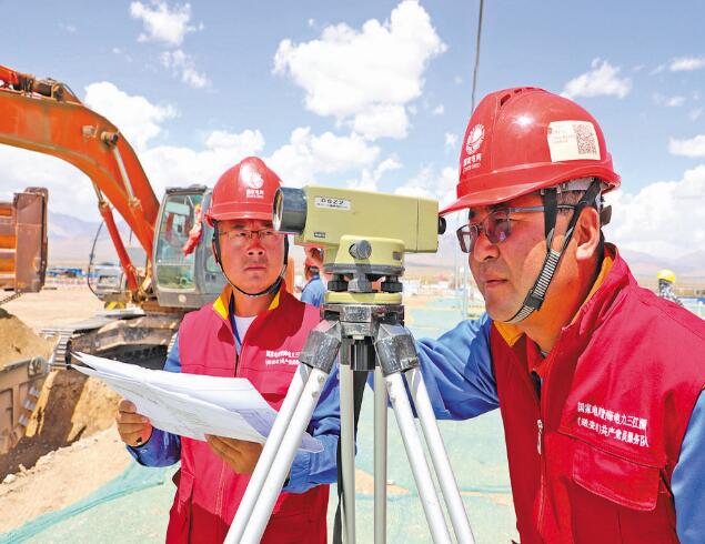 黨員在德令哈(托素)750千伏變電站測量基礎(chǔ)數(shù)據(jù)。鄒建華 攝