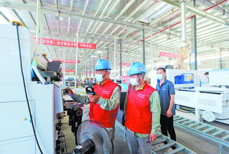 國家電網(wǎng)湖北電力(孝感)共產(chǎn)黨員服務隊隊員來到應城市一家企業(yè)的生產(chǎn)車間,幫助企業(yè)檢查用電設備。