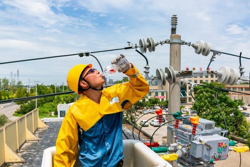 國網(wǎng)山東濟寧供電公司員工在烈日高溫下完成智能開關更換作業(yè)后補充水分。