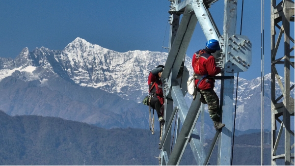 在四川甘孜藏族自治州瀘定縣,金沙江上游—湖北特高壓直流輸電工程建設(shè)正酣,電力施工人員在山脊上爭分奪秒組裝塔材。“我們所在的標段處于高海拔重冰區(qū),新建的上百座鐵塔坡度均大于35度,最陡達65度,有的塔腿高差近20米,仿佛在‘刀背’上架鐵塔。”國網(wǎng)四川送變電公司項目經(jīng)理鄒忠旋介紹。這個全球海拔最高的特高壓直流輸電工程,投運后每年可向華中地區(qū)輸送電量近400億千瓦時,替代燃煤超1700萬噸。