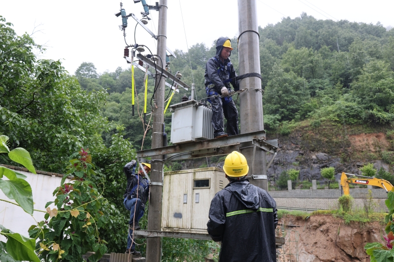 國(guó)網(wǎng)陜西商洛柞水縣供電公司員工冒雨搶修營(yíng)湖小區(qū)臺(tái)區(qū)。