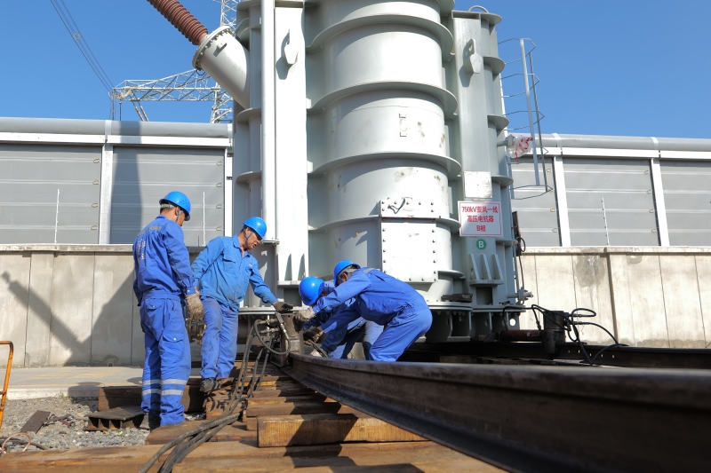 國(guó)網(wǎng)新疆超高壓分公司員工在750千伏亞中變電站開展高抗整體平移更換。