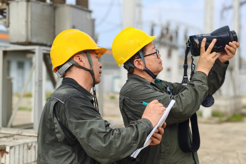 國(guó)網(wǎng)河北邢臺(tái)供電公司員工在35千伏華龍站進(jìn)行巡檢測(cè)溫。