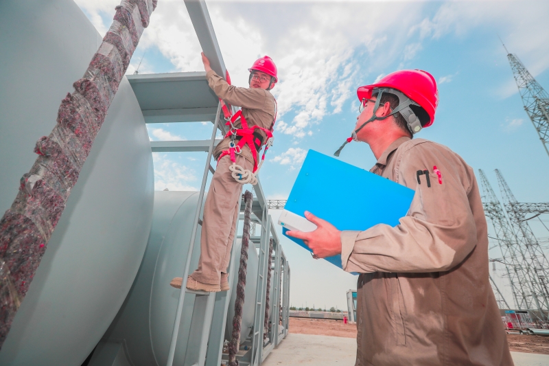 國(guó)網(wǎng)天津送變電公司員工在天津南1000千伏變電站檢查主變油罐壓力。
