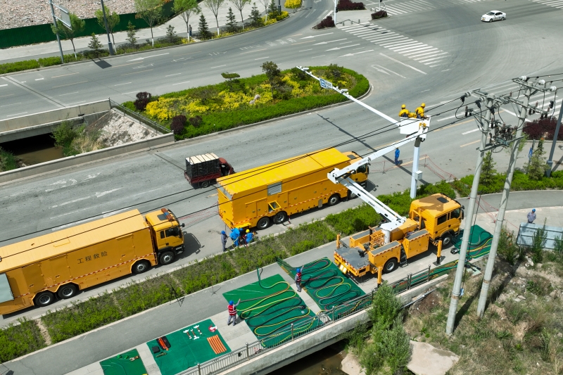 國(guó)網(wǎng)青海西寧供電公司員工在10千伏堡十路現(xiàn)場(chǎng)開展電源車并網(wǎng)作業(yè)。