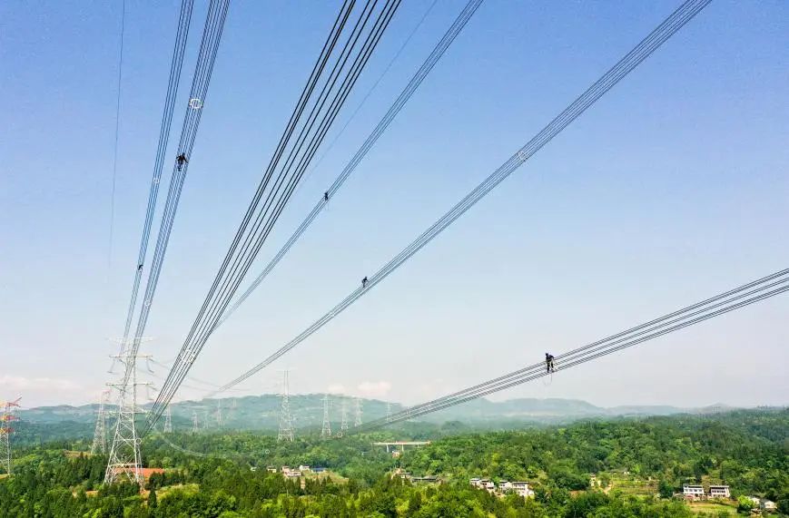 國(guó)網(wǎng)四川電力施工人員開展川渝特高壓工程輸電線路間隔棒安裝作業(yè)