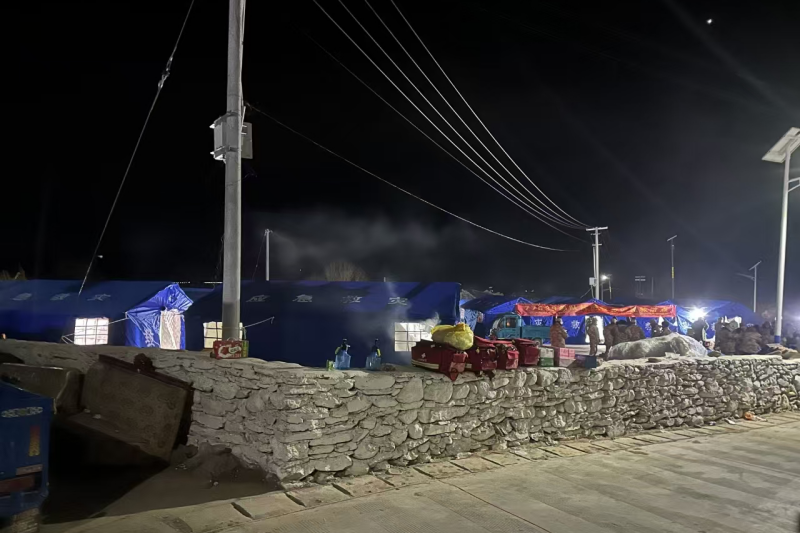 ▲國網(wǎng)西藏電力員工連夜奮戰(zhàn),點亮定日縣安置點帳篷