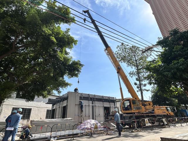 在施工技術(shù)上,江門蓬江供電局不僅引入了自動(dòng)化挖掘機(jī)、起重機(jī)、混凝土攪拌車等機(jī)械,還摒棄傳統(tǒng)配電站的磚瓦結(jié)構(gòu),采用高強(qiáng)度、輕質(zhì)、耐腐蝕的成品預(yù)制墻板及鋼結(jié)構(gòu)等新型建筑材料,結(jié)合裝配式施工工藝,減少以往現(xiàn)場焊接、切割等工藝帶來的環(huán)境污染,大大縮短了施工周期,還減少建筑垃圾的產(chǎn)生。“與傳統(tǒng)純?nèi)斯な┕し绞较啾?,本工程機(jī)械化率達(dá)到85%,工期壓縮了80%,大大減少了對(duì)附近居民的影響,也降低了施工過程中的安全隱患。”羅益榮說。