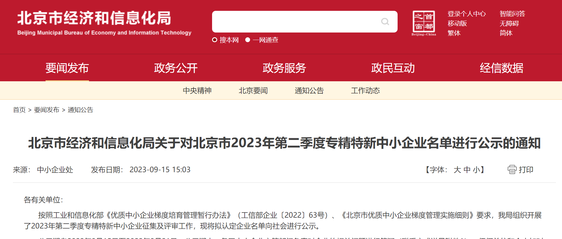 中國電力網(wǎng)訊(通訊員 時君柳) 9月15日,北京市經(jīng)濟和信息化局公布了《關(guān)于對北京市2023年第二季度“專精特新”中小企業(yè)名單進行公示的通知》,國網(wǎng)信通產(chǎn)業(yè)集團國電通憑借行業(yè)專業(yè)化、技術(shù)創(chuàng)新力、服務精細化從眾多參選企業(yè)中脫穎而出,獲得2023年度北京市“專精特新”中小企業(yè)榮譽稱號。