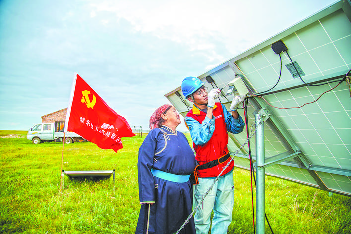 國(guó)家電網(wǎng)蒙東電力(呼倫貝爾新巴爾虎右旗)共產(chǎn)黨員服務(wù)隊(duì)隊(duì)員為牧民檢查光伏板。宋天培 攝