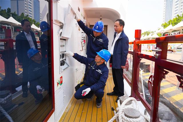 為確保首航成功,當(dāng)天國網(wǎng)福州供電公司臺江政企服務(wù)班的工作人員提前到達(dá)現(xiàn)場對游輪的岸電系統(tǒng)進(jìn)行義務(wù)檢查,確保其可靠運行。