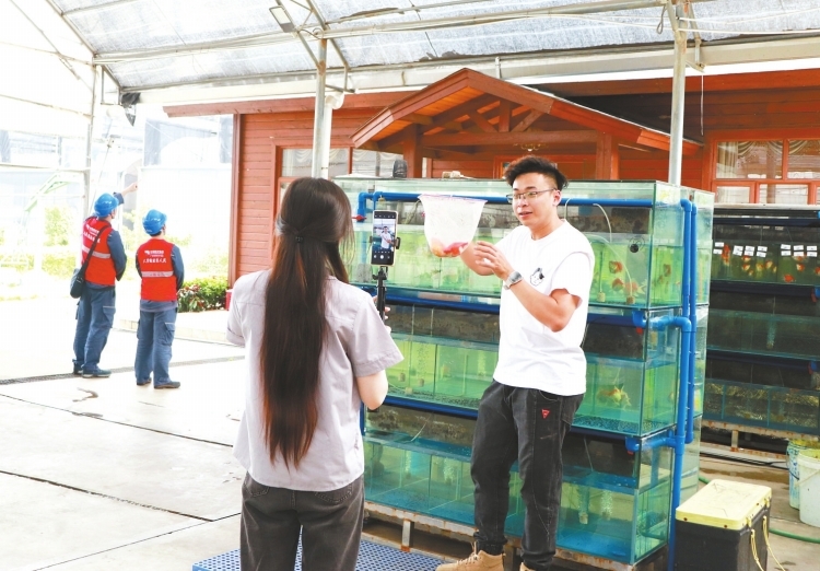 廣東省佛山市南海區(qū)里水鎮(zhèn)擁有全國(guó)最大的觀賞魚養(yǎng)殖產(chǎn)銷基地,近200家錦鯉養(yǎng)殖企業(yè)在此落戶,八成從事電商銷售。“這是我們今年賣得最好的紅白品種,體形流暢粗壯,墨質(zhì)醇厚有光澤。”廣東惠和錦錦鯉養(yǎng)殖公司主播黃小姐正在直播間介紹著“6·18”促銷活動(dòng)。